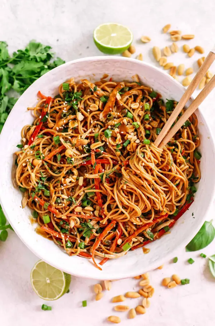 These Saucy Peanut Noodles are loaded with shredded chicken, bell pepper, green onions, crunchy peanuts and fresh herbs all tossed together in a delicious peanut sauce! These Saucy Peanut Noodles are loaded with shredded chicken, bell pepper, green onions, crunchy peanuts and fresh herbs all tossed together in a delicious peanut sauce!